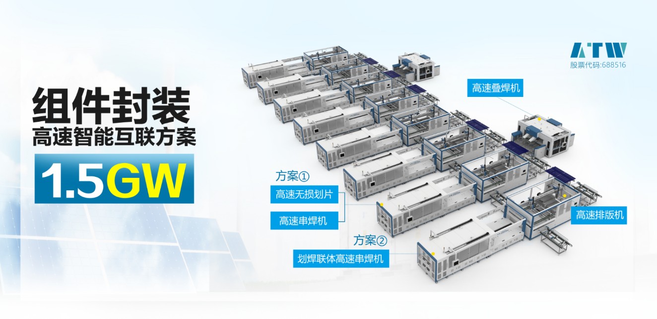 The newly launched high-speed typesetting machine AP001A-100A has the characteristics of high precision, high efficiency, high stability, etc. It can meet the production cycle of 8000-10000 pieces/hour, adapt to all current glass sizes, and can also flexibly configure the cutting process to meet the personalized needs of different battery strings. The high-speed stitch welding machine AM023D-200 has significant advantages such as 18s high cycle, high regularity accuracy and high welding reliability. At the same time, the equipment adopts a modular development method, which can achieve rapid cutting within 6 hours. ATW's new product not only has all-round improvements in production efficiency, compatibility, safety performance, and ease of operation, but also aims to meet customer production needs and continue to upgrade to the direction of intelligent manufacturing. We hope that through the mutual integration of the construction of the equipment information platform and the application data integration, we can help the photovoltaic industry chain achieve in-depth lean operation, and ultimately not only achieve high consistency of product quality for customers, but also greatly improve production efficiency and operating benefits.